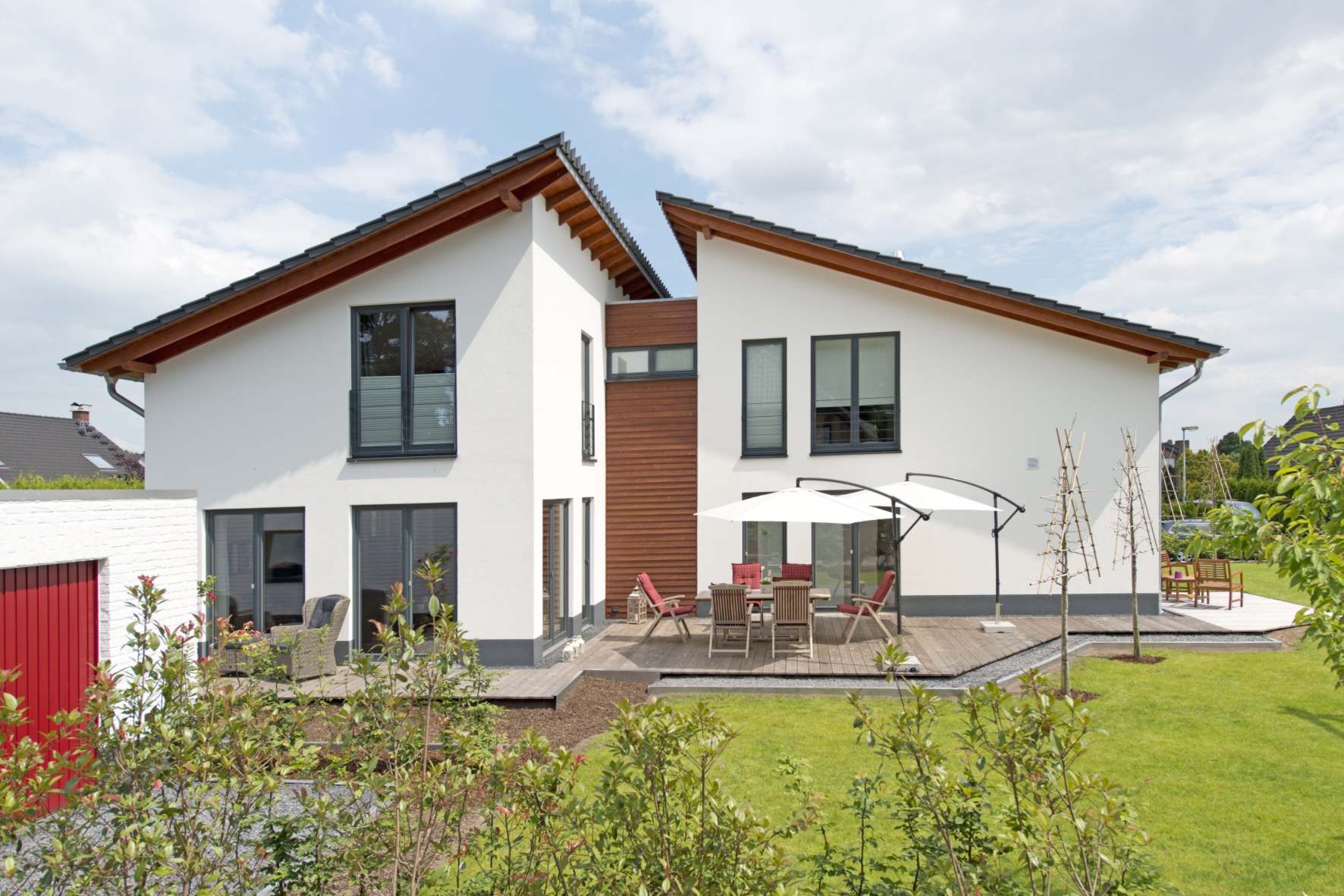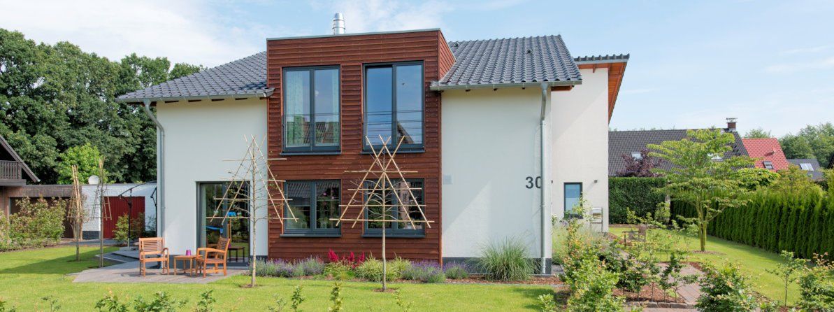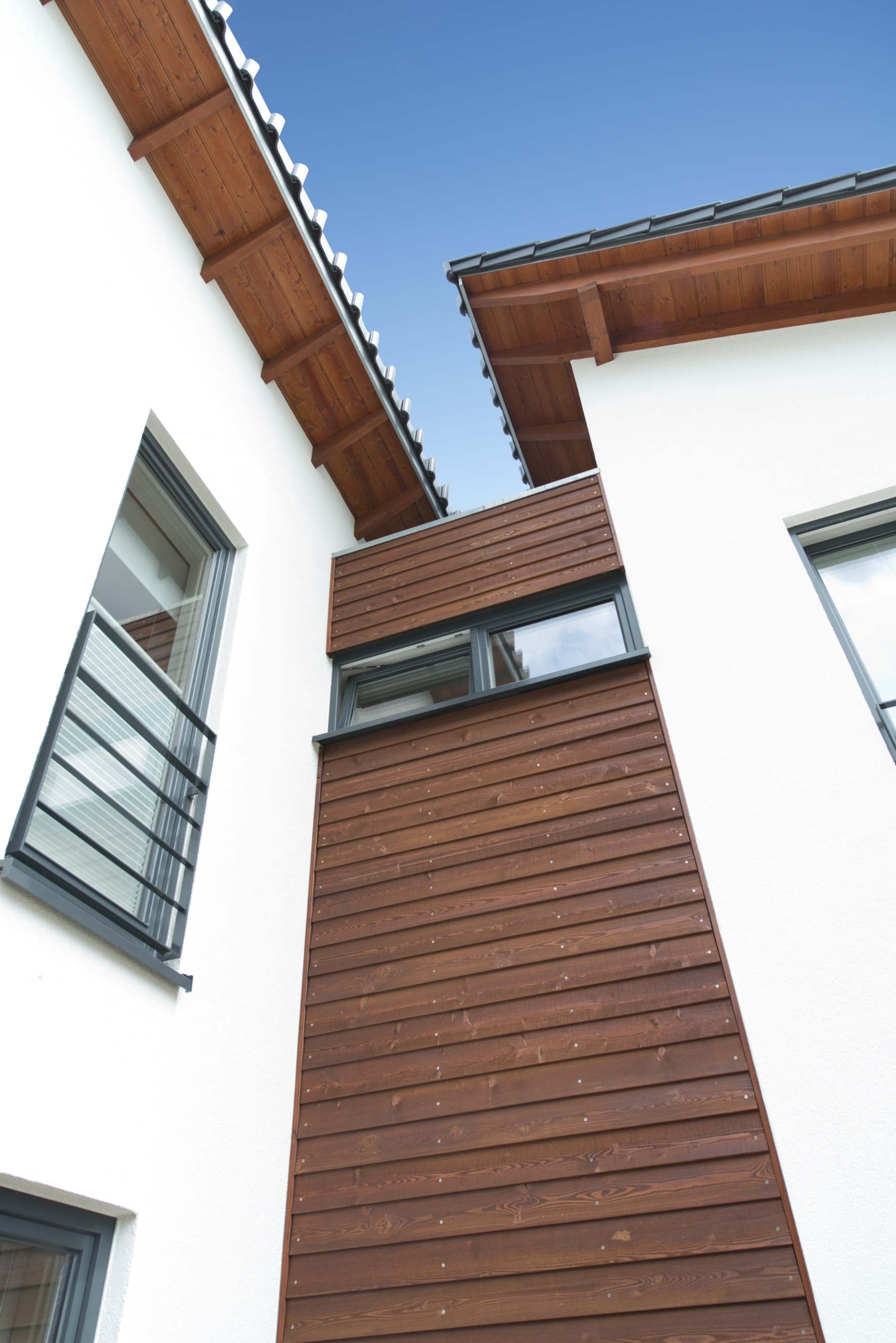 Een zeer interessant woongebouw van twee generaties met een tegenovergesteld pent dak en een tussenvleugel met een plat dak. De gevel bestaat uit een beglaasde Lärchenholz-Stülpschalung en een pleister op een composietsysteem van houtvezel-thermische isolatie.