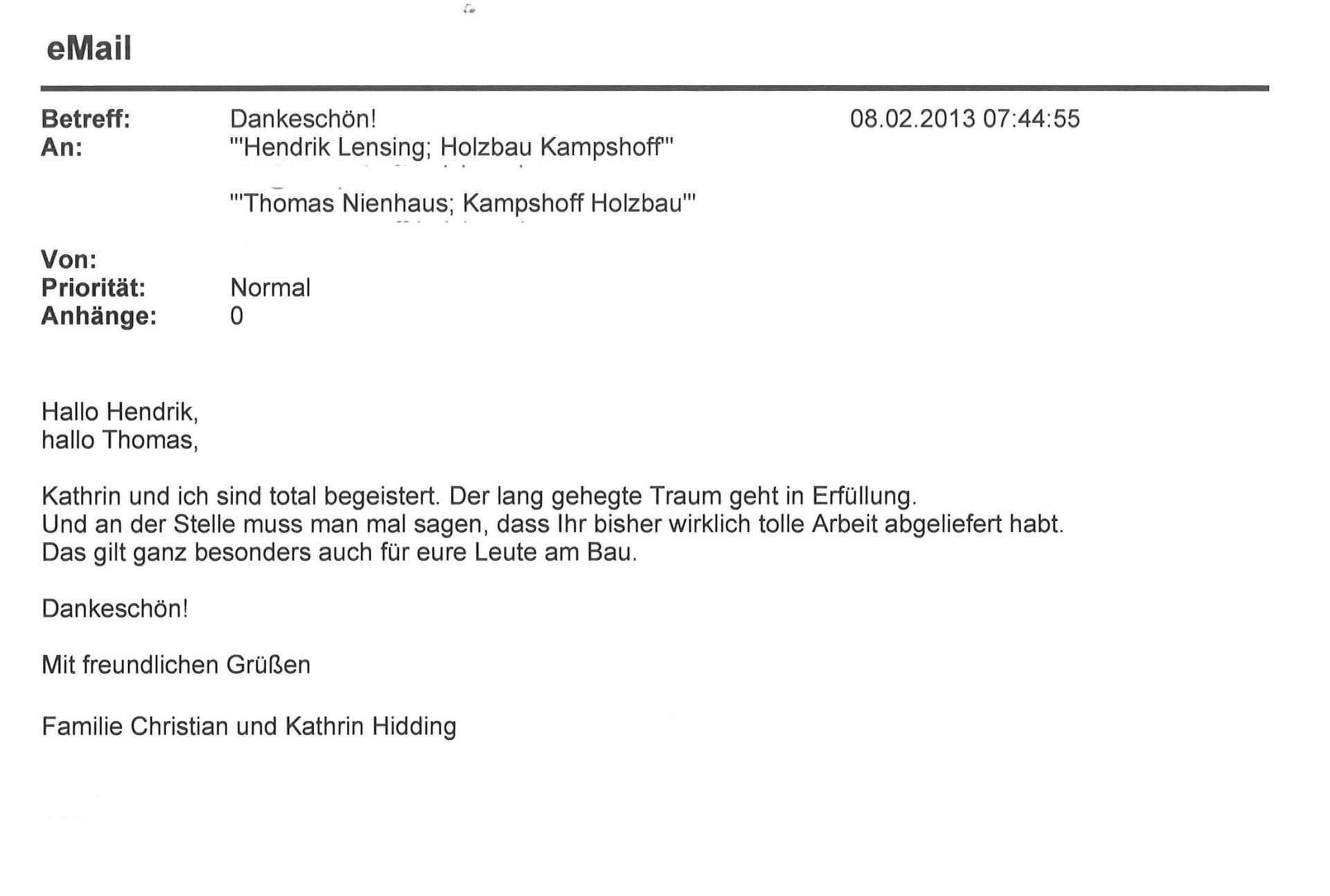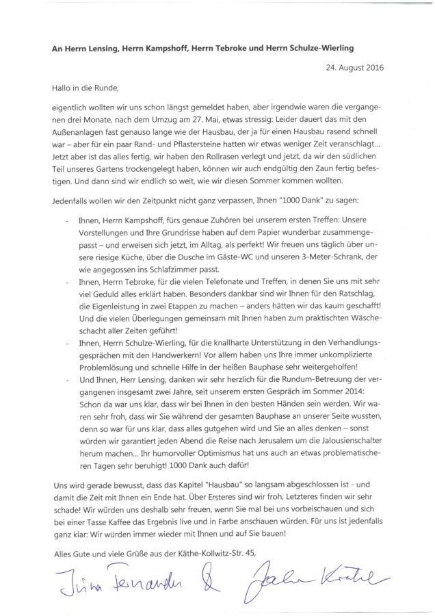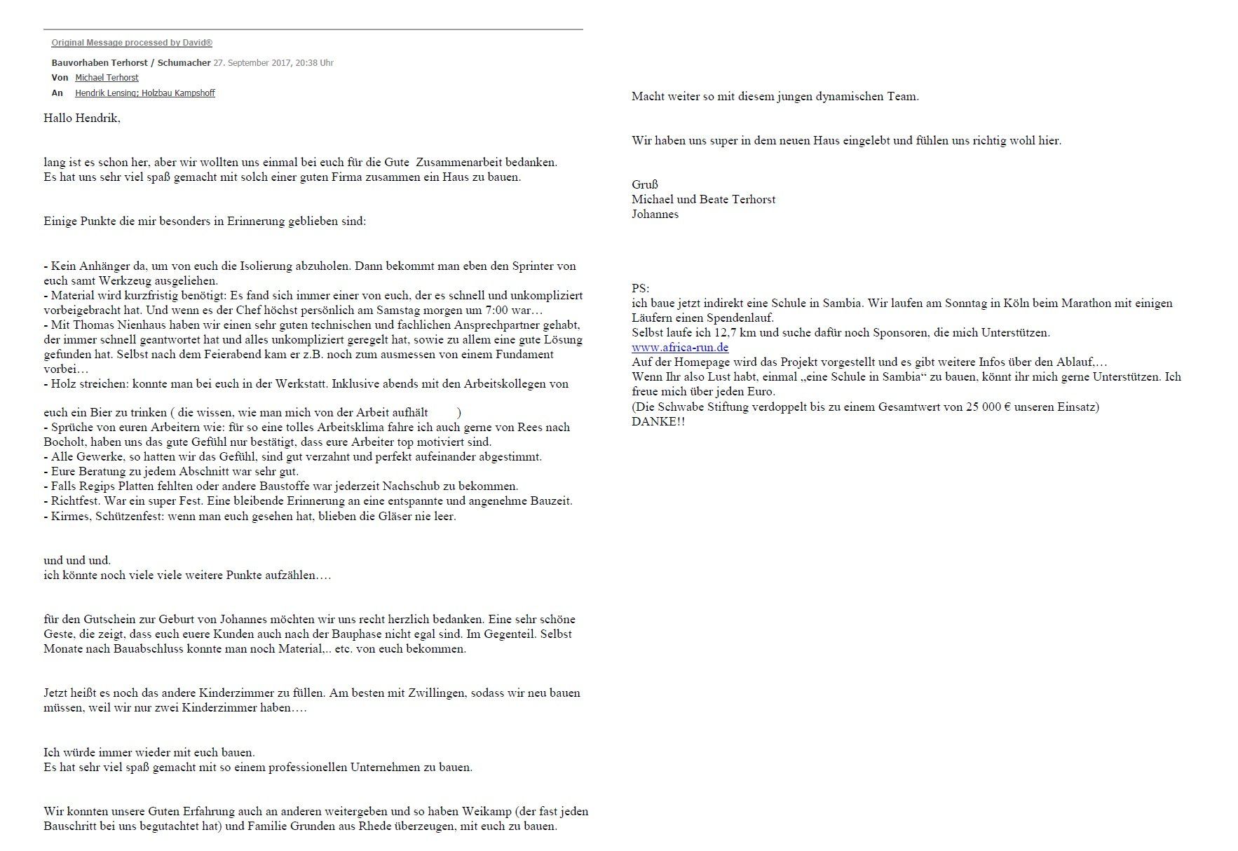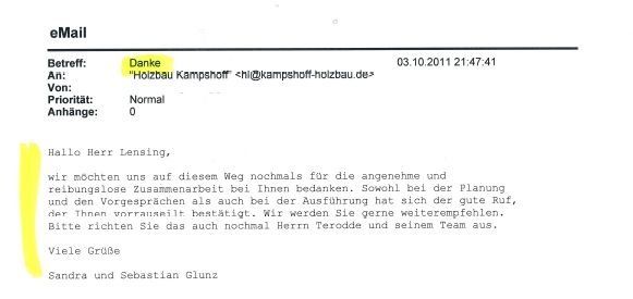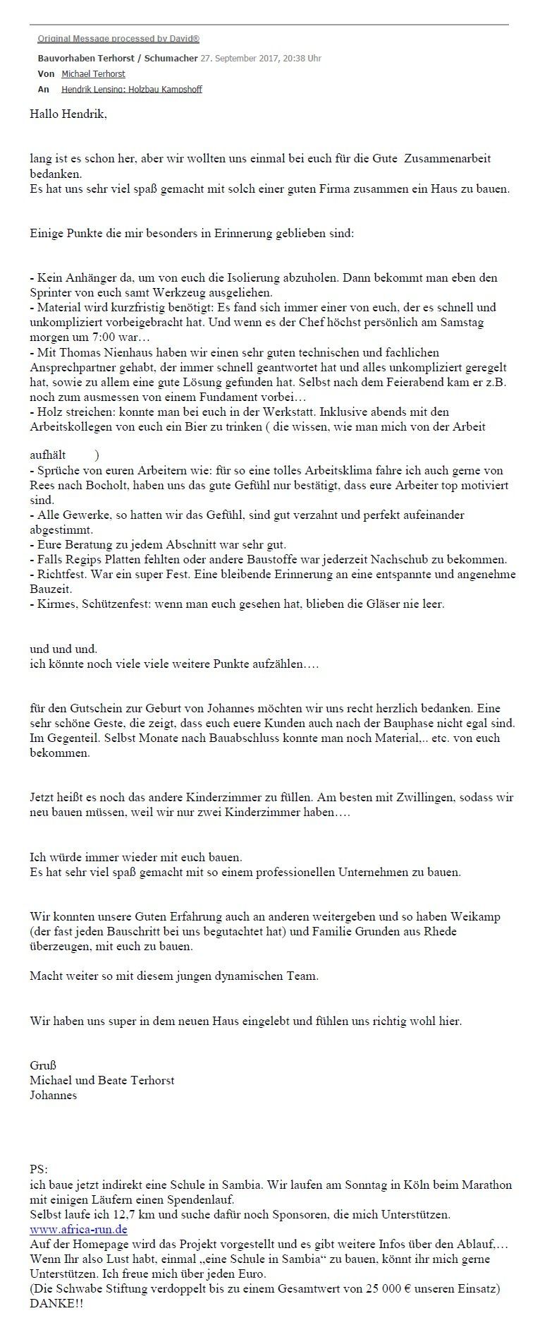 We ontvangen een groot deel van onze bestellingen op aanbeveling van onze tevreden klanten. Hier zijn enkele brieven van onze tevreden klanten aan wie we een gebouw in houtconstructie hebben gemaakt. Natuurlijk zijn we blij om deze positieve reacties van onze Holzhaus-klanten te laten zien en ze maken ons een beetje trots. Ze laten zien dat we op de goede weg zijn.