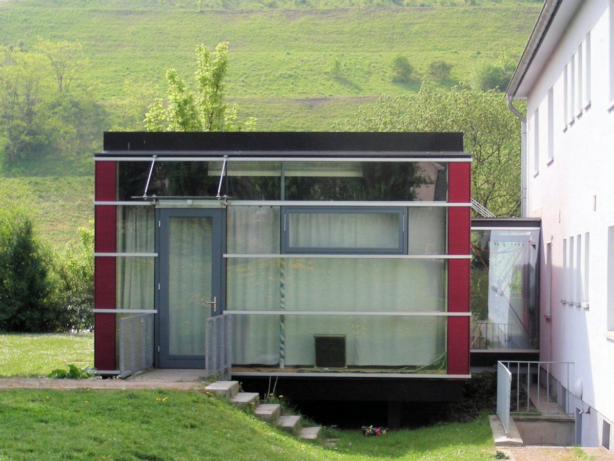 Het gebouw staat op twee betonnen fundamenten waardoor het lijkt op een zwevende kubus.