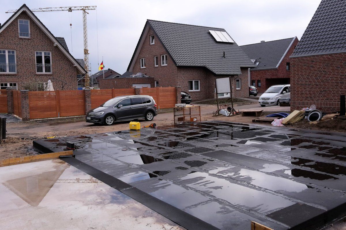 Die Randschalung wird aufgestellt und die Eisenbewehrung wird verlegt. Dann wird die Bodenplatte gegossen und oberseitig mit einer Schweißbahn abgeklebt.