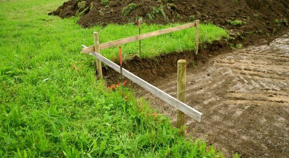 Ein Schnurgerüst wird aufgestellt. Die Lage der Bodenplatte oder des Kellers wird durch einen Vermessungsingenieur bestimmt.