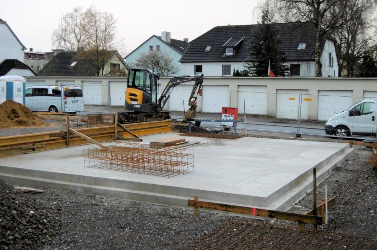 Die Entwässerungsleitungen unterhalb des Baukörpers werden verlegt und es wird eine Sauberkeitsschicht eingebaut.