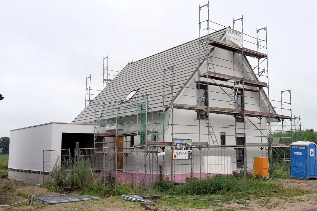 Die Dachdecker- und die Fassadenarbeiten werden zeitgleich mit dem Innenausbau ausgeführt. Die Wandfliesen werden angebracht.